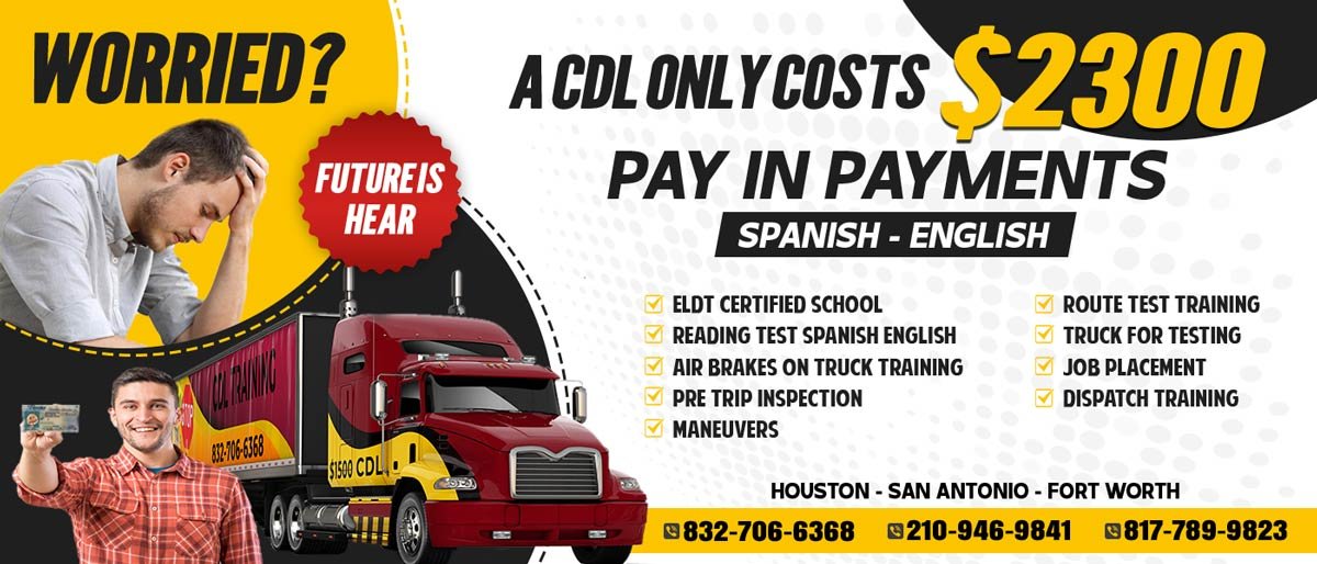 with the very low cost of $2300 Pay in Payments, it is the best and most sincere option to receive your CDL license and thus be able to provide a